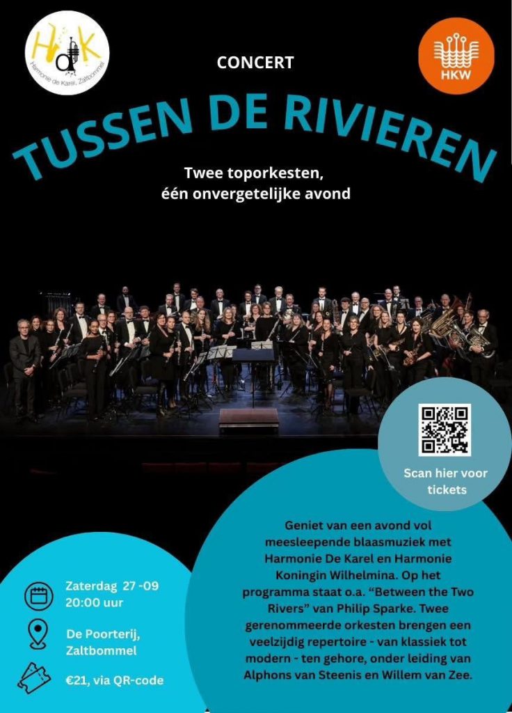 Op zaterdagavond 27 september is HKW te gast bij Harmonie de Karel uit Zaltbommel. Met als thema “Tussen de rivieren (kaartverkoop)” zullen beide orkest een gevarieerd programma op hoog niveau laten horen.